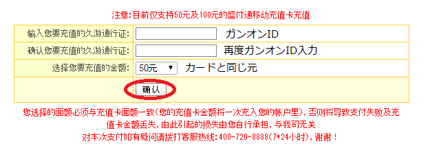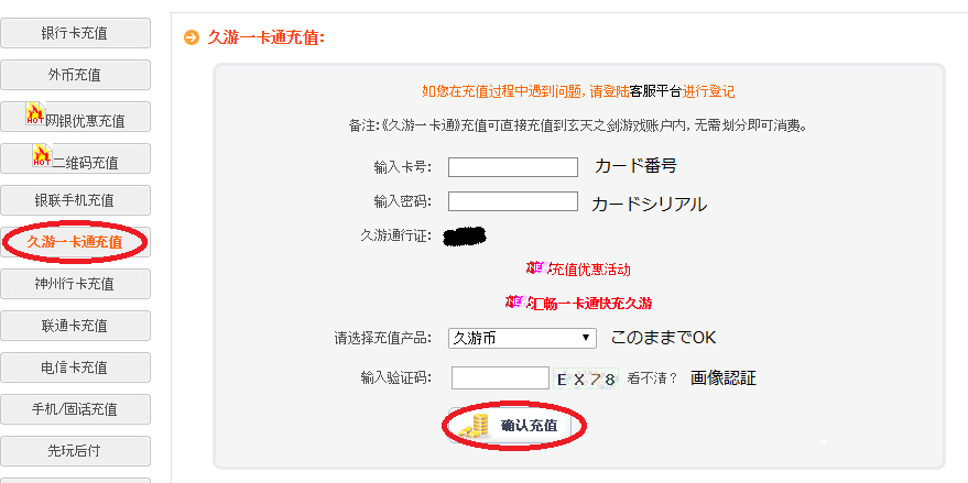 1.久游一卡通充値をクリックし、カード番号・カードシリアル・画像認証を入力し确认充値をクリックします。