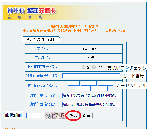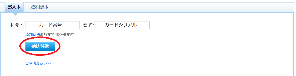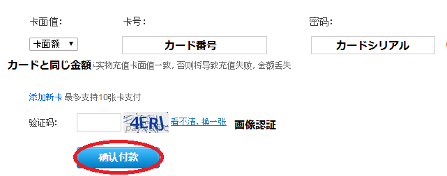 3.支払い元・カード番号・シリアルを入力後、确认をクリックします。