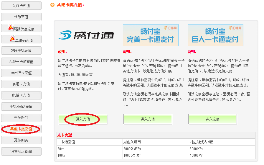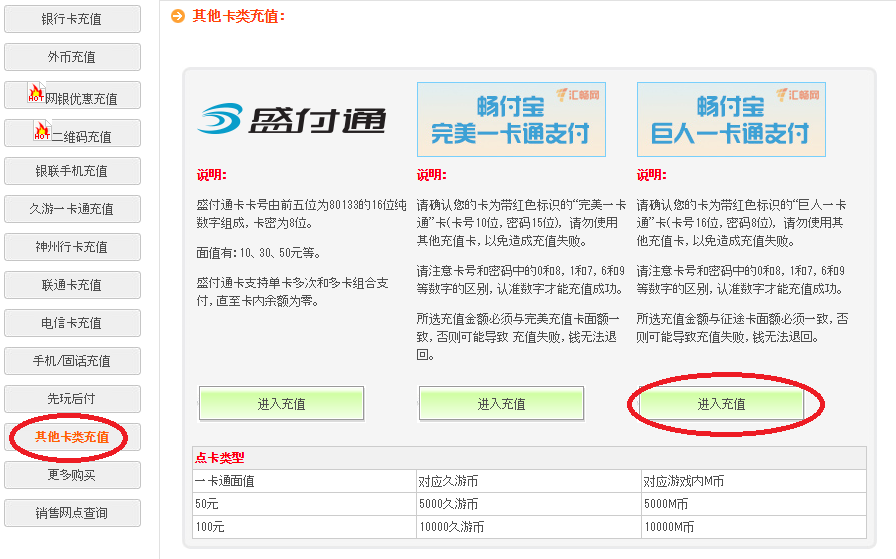 骏网一卡通http://www.hairui.jp/goods/detail.php?xid=fZqq1PFd&id=1922 盛大一卡通http://www.hairui.jp/goods/detail.php?xid=fZqq1PFd&id=1655 征途一卡通 网易一卡通http://www.hairui.jp/goods/detail.php?xid=fZqq1PFd&id=1653 搜狐一卡通http://www.hairui.jp/goods/detail.php?xid=fZqq1PFd&id=1740 久游一卡通http://www.hairui.jp/goods/detail.php?xid=fZqq1PFd&id=1786 完美一卡通http://www.hairui.jp/goods/detail.php?xid=fZqq1PFd&id=1775 カード種類によっては100元カードあり。