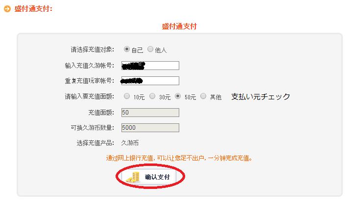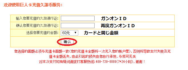 2.ガンオンIDを入力し、支払い元を選択後确认をクリックします。